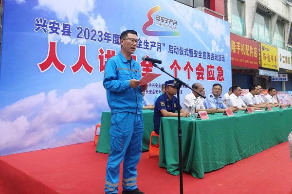 “為認(rèn)真履行企業(yè)主要負(fù)責(zé)人第一責(zé)任人責(zé)任,我承諾:全面落實(shí)安全生產(chǎn)法規(guī)定職責(zé),帶頭研究組織本企業(yè)重大事故隱患排查整治、帶頭落實(shí)全員安全生產(chǎn)崗位責(zé)任,發(fā)揮管理團(tuán)隊(duì)和專家作用……堅(jiān)決防范遏制各類生產(chǎn)安全事故發(fā)生?!?月16日,廣西興安縣安全宣傳咨詢活動(dòng)現(xiàn)場(chǎng),興安海螺公司總經(jīng)理任文皓作為全縣企業(yè)代表,作出鄭重承諾。
