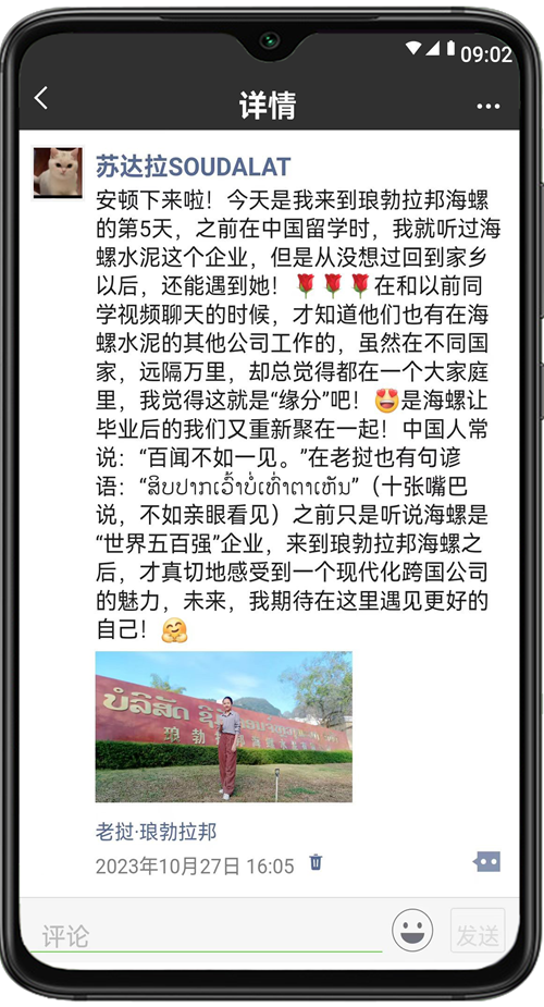 2023年是共建“一帶一路”倡議提出十周年,十年來,海螺水泥堅持人才“本地化”培養(yǎng),現(xiàn)在,海螺的大家庭里已有3000多名外籍員工,他們見證了一座座海螺工廠的拔地而起,還親身經(jīng)歷了海螺發(fā)展帶來的變化,在海螺收獲了成長和友誼?,F(xiàn)在,就讓我們打開“朋友圈”,一起來看看他們的分享吧!