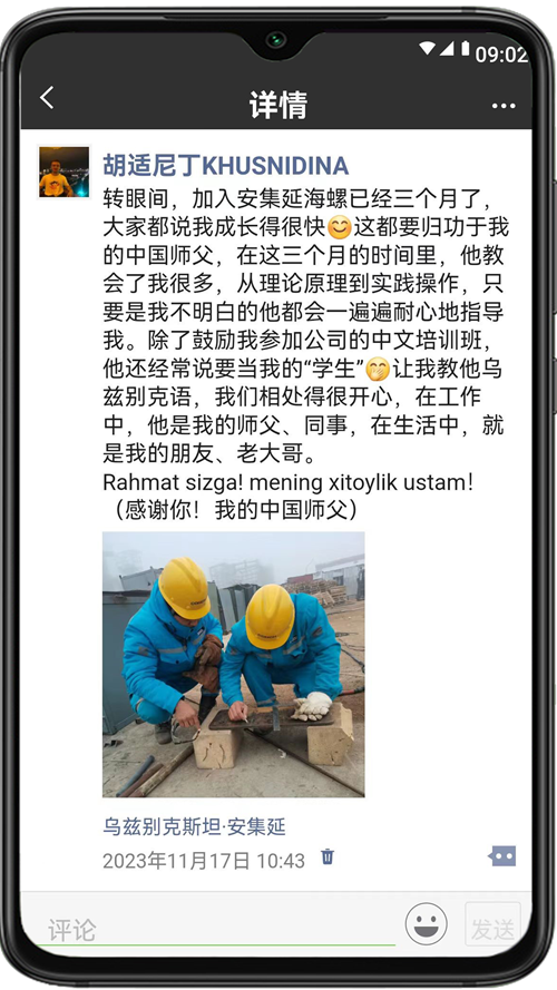 TUQMIRZAEV KHUSNIDINA(中文名:胡適尼?。?023年加入烏茲別克斯坦安集延海螺,現(xiàn)從事機械維修工作,照片為胡適尼丁和他的中國師父。