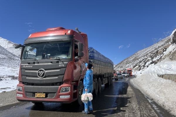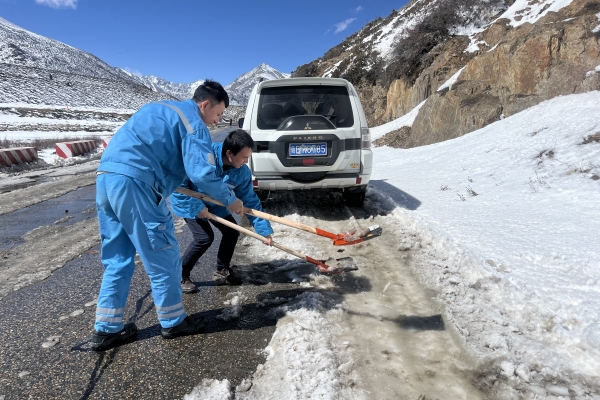 西藏八宿海螺學(xué)雷鋒志愿服務(wù)隊(duì)組織清理318國道積雪,并為滯留司機(jī)發(fā)放午餐。
