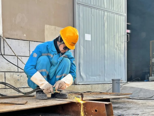 卡爾希海螺維修工貝克正在進(jìn)行鋼材下料作業(yè),他說(shuō):“Payvandchi qo‘lidagi yong‘in – uskunaning barqaror ishlashining kafolati.(用我手中的焊槍?zhuān)U显O(shè)備穩(wěn)定運(yùn)行)”