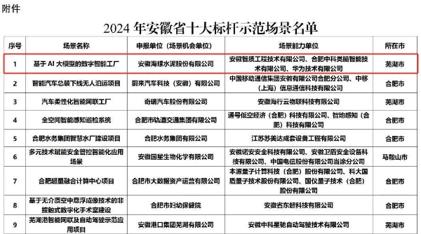 2025年6月9日,省科學(xué)技術(shù)廳發(fā)布2024年度安徽省十大標(biāo)桿示范場(chǎng)景。由海螺水泥打造的“基于 AI 大模型的數(shù)字智能工廠(chǎng)”場(chǎng)景入選其中。