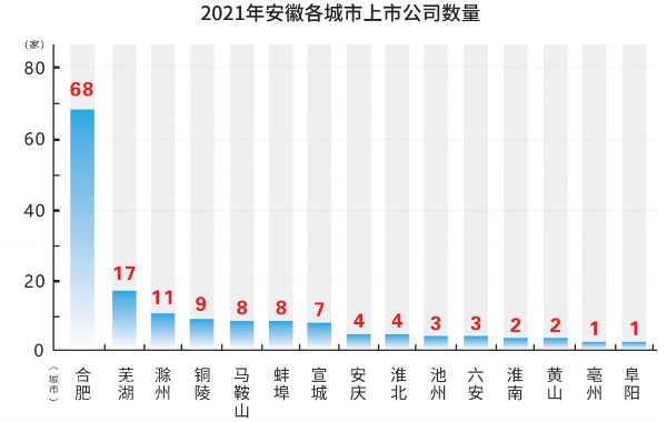 上市公司是區(qū)域經(jīng)濟(jì)發(fā)展的“晴雨表”。截止2021年底,合肥上市公司數(shù)量達(dá)到68家,在省內(nèi)遙遙領(lǐng)先,在全國內(nèi)地289個(gè)城市排名居第14位;蕪湖和滁州上市公司數(shù)量分別為17家、11家。