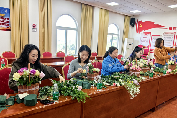 花藝活動正式開始,女員工詳細(xì)講解了不同花材的特點(diǎn)及插花的基本技巧,如何根據(jù)花材的高低錯落進(jìn)行搭配,怎樣通過色彩組合營造出和諧美感等。實(shí)操環(huán)節(jié)將活動推向高潮,她們小心翼翼地修剪花枝,精心構(gòu)思每一朵花的擺放位置,將自己對美的理解與情感融入其中。有的員工以玫瑰為主花,搭配上幾枝嫩綠的尤加利葉,打造出熱情而不失清新的作品;還有的員工巧妙運(yùn)用坦尼克與滿天星,營造出夢幻浪漫的氛圍。在創(chuàng)作過程中,大家相互交流、分享創(chuàng)意,現(xiàn)場歡聲笑語不斷,每一件作品都承載著員工們的獨(dú)特創(chuàng)意與美好期許,它們不再僅僅是一束束鮮花,更是員工們內(nèi)心世界的生動表達(dá)。