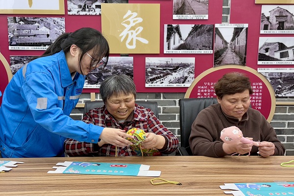 在艾草錘制作環(huán)節(jié),銀發(fā)與青春的身影交相輝映。志愿者采取“1+1”結(jié)對服務模式一邊介紹,一邊示范制作步驟。老人們興致勃勃地跟隨志愿者一起將艾草填充布袋,用花布包裹裝飾,并用棉線綁扎錘柄。78歲的嚴奶奶手持艾草錘欣喜表示:“這錘子好看又實用,孩子們教得真耐心。”