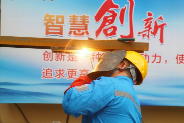同一賽場(chǎng)上,制造分廠機(jī)械維修工馮雙正在馬不停蹄地進(jìn)行手工焊接,飛濺的焊花與“智能創(chuàng)新”的標(biāo)語(yǔ)交相輝映。(陳龍/攝)