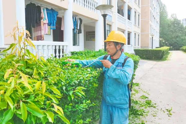 辦公室后勤綠化工黃斗忠正在后勤區(qū)域?qū)G植進(jìn)行修剪,讓綠植既保持自然生機(jī)又呈現(xiàn)幾何美感,試圖將工業(yè)廠區(qū)變成園林式生態(tài)空間。(楊玲/攝)