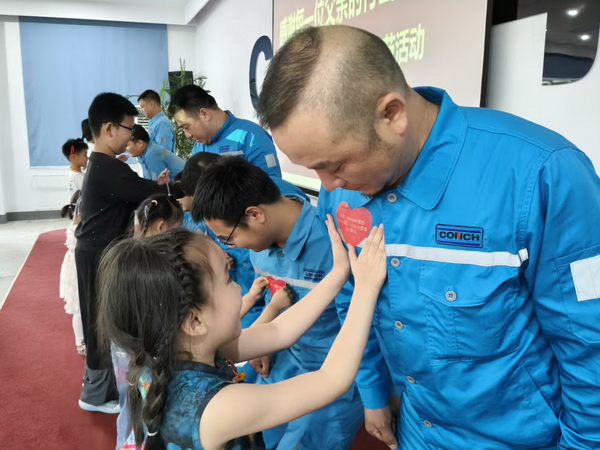 工廠還為每位爸爸準(zhǔn)備了“職場(chǎng)父親愛(ài)心勛章”,由孩子們親手為爸爸佩戴。制造分廠一名員工在收獲女兒的勛章以及親吻時(shí),頓時(shí)紅了眼眶,勛章上的暖心話(huà)語(yǔ)-“爸爸,您是全家的支柱,有您才有家,一定要注意安全,讓我們安心”,就是女兒沒(méi)有說(shuō)出來(lái)的期盼。