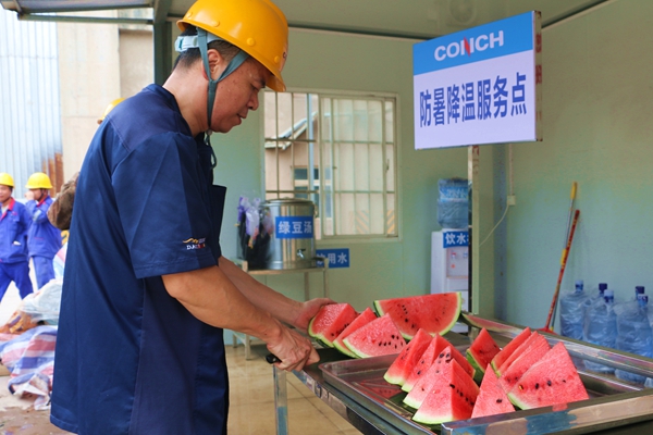慰問(wèn)組先后前往窯中廣場(chǎng)、礦山爆破區(qū)、水泥發(fā)運(yùn)等高溫作業(yè)點(diǎn),將精心準(zhǔn)備的鹽汽水、綠豆湯、西瓜等防暑降溫物資送到員工手中,確保一線員工在高溫環(huán)境下能夠及時(shí)補(bǔ)充水分、預(yù)防中暑。期間公司安全環(huán)保處還現(xiàn)場(chǎng)開(kāi)展了高溫作業(yè)安全培訓(xùn)、夏季中暑應(yīng)急演練,重點(diǎn)強(qiáng)調(diào)“避開(kāi)午間高溫時(shí)段”“輪換作業(yè)”“穿戴防護(hù)裝備”等事項(xiàng),設(shè)備保全處對(duì)生產(chǎn)現(xiàn)場(chǎng)的所有空調(diào)、風(fēng)扇、通風(fēng)設(shè)備進(jìn)行全面檢修,確保降溫設(shè)施正常運(yùn)行。辦公室廣泛聽(tīng)取一線員工對(duì)防暑降溫工作的建議,進(jìn)一步優(yōu)化高溫保障措施,切實(shí)保障員工夏季作業(yè)安全。