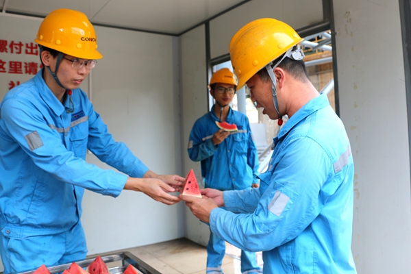 “大家辛苦了!一定要注意勞逸結(jié)合。”公司慰問(wèn)組反復(fù)叮囑各班組長(zhǎng)科學(xué)調(diào)配作業(yè)時(shí)間,礦山分廠爆破安全員熊師傅接過(guò)鹽汽水,臉上洋溢著笑容:“公司這么關(guān)心我們,這份清涼來(lái)得太及時(shí)了,我們一定加倍努力,保障生產(chǎn)安全高效!”