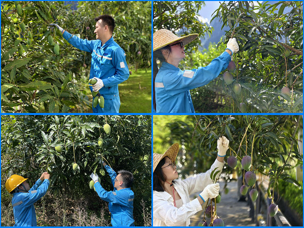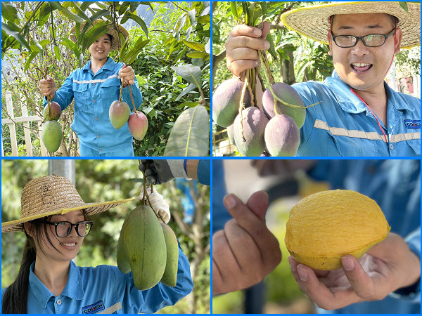 “瞧瞧這大家伙,一個頂倆!比我的臉還大!”一位員工提起起沉甸甸的金煌芒,笑容如芒果般飽滿。旁邊經驗豐富的“芒果之鄉(xiāng)”田東縣的同事邊剪邊傳授:“蒂把留一小截,果子更耐放?!毙录尤氲哪贻p員工起初動作略顯生澀,然而幾番嘗試后也漸入佳境,笨拙卻認真,汗水混著笑意,映著陽光。銷售處的馮姐捧著自己摘下的貴妃芒,嗅著那獨特的馥郁香氣,不禁感嘆:“這香氣,比賬本上的數(shù)字更令人心甜呢!”