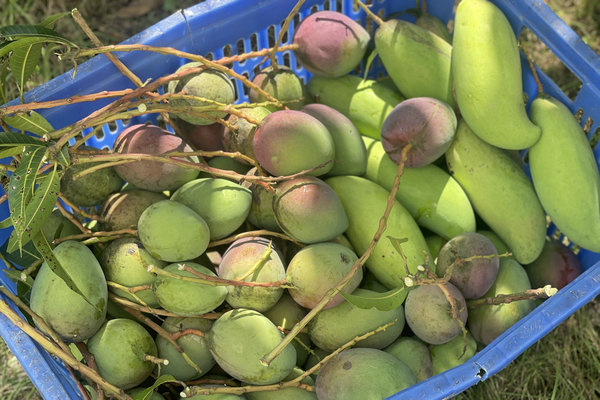 果園內,各色芒果如同珍寶綴滿枝頭:貴妃芒雍容華貴,金煌芒燦爛輝煌,象牙芒頎長優(yōu)雅,臺農質樸可愛,桂七則散發(fā)著獨屬于百色土地的濃郁醇香。采摘隊伍穿梭其間,枝葉間“咔嚓”聲此起彼伏,熟透的果實應聲而落。籃筐漸漸豐盈起來,仿佛裝滿了整個夏天濃縮的甘甜。有人踮起腳尖小心翼翼,有人架起梯子攀援而上,還有人默契配合,接應高處摘下的果實——人聲與果香交織纏繞,讓果園霎時成了歡樂的流動盛宴。